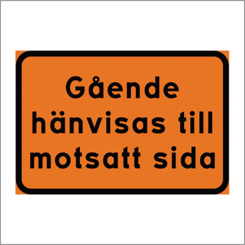 Tillfällig vägskylt med text Gående hänvisas till motsatt sida.