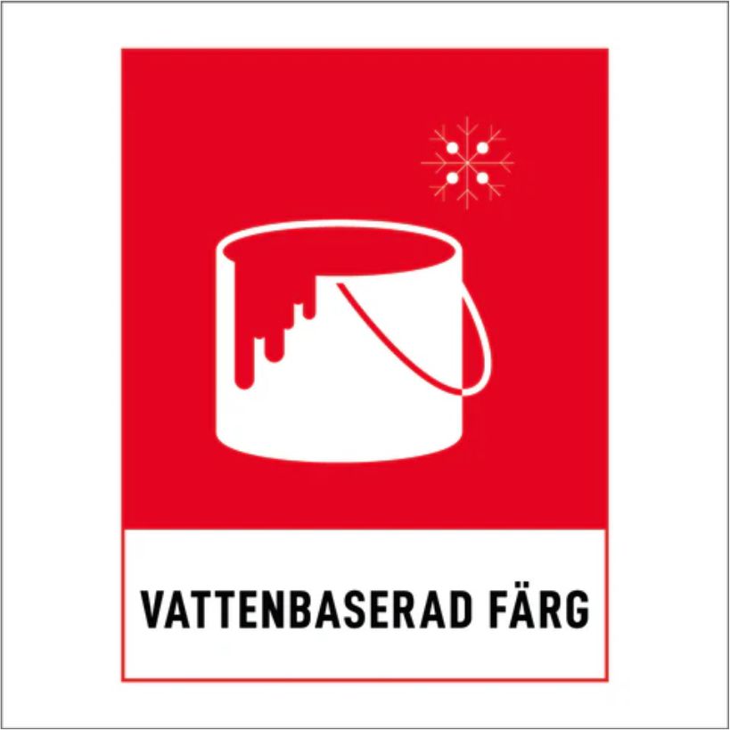 Återvinningsskylt med text VATTENBASERAD FÄRG.